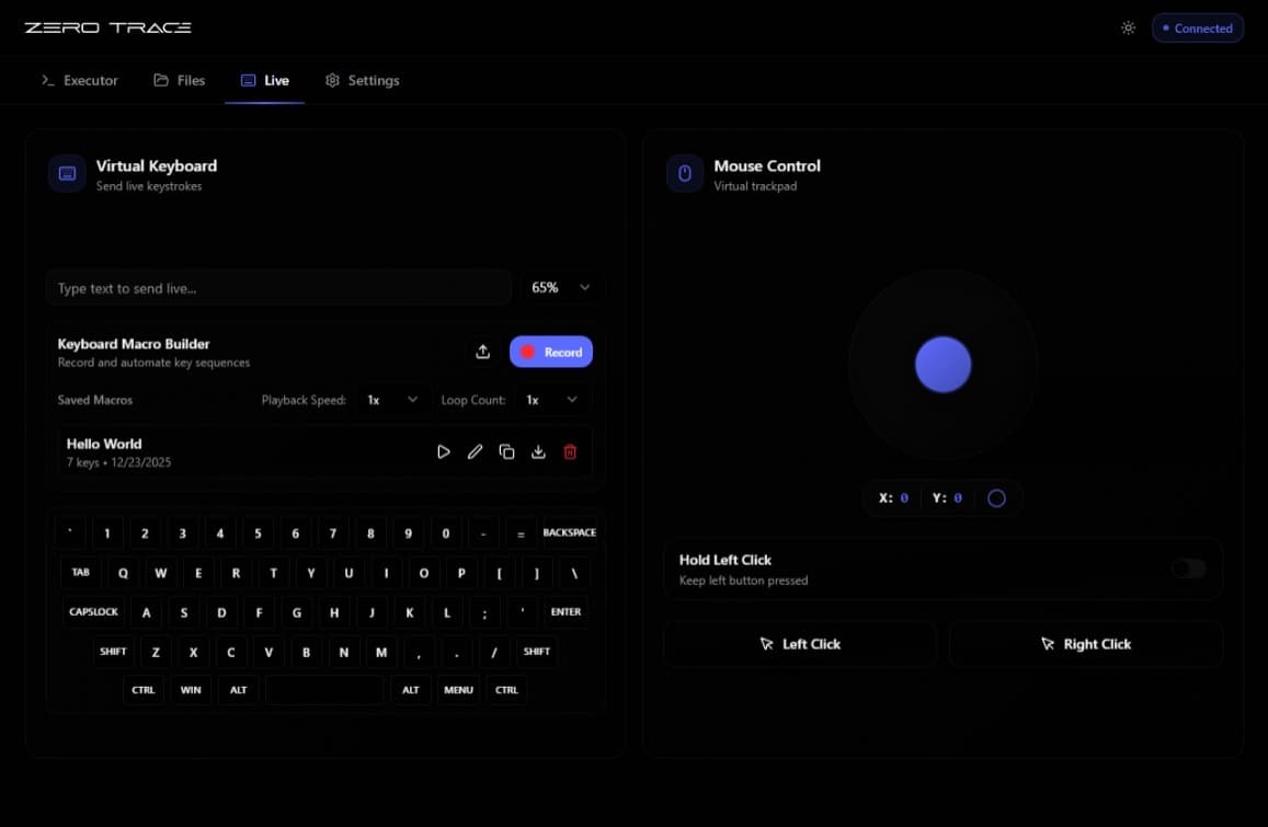 - Directly control the mouse, send keystrokes, draw, or type live as a keyboard.